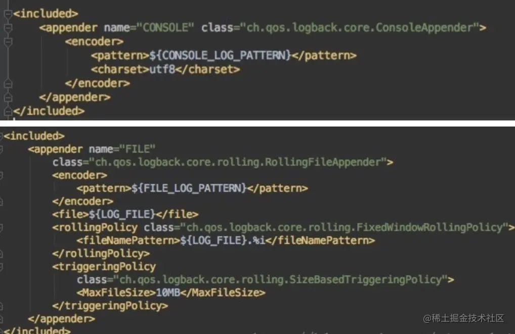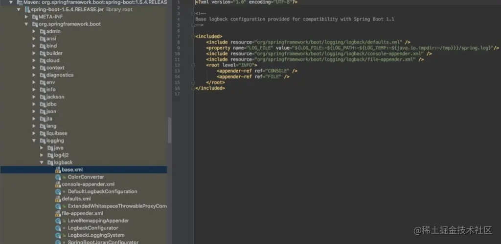 这里就是Springboot对logback配置的地方,base.xml里,可以看到root level=INFO,这个代表该项目默认是输出最低为info级别的日志。然后看到有两个append-ref,分别为console何file,这两个分别对应上面引用的两个include resource里的xml,每个名字对应一个处理类。