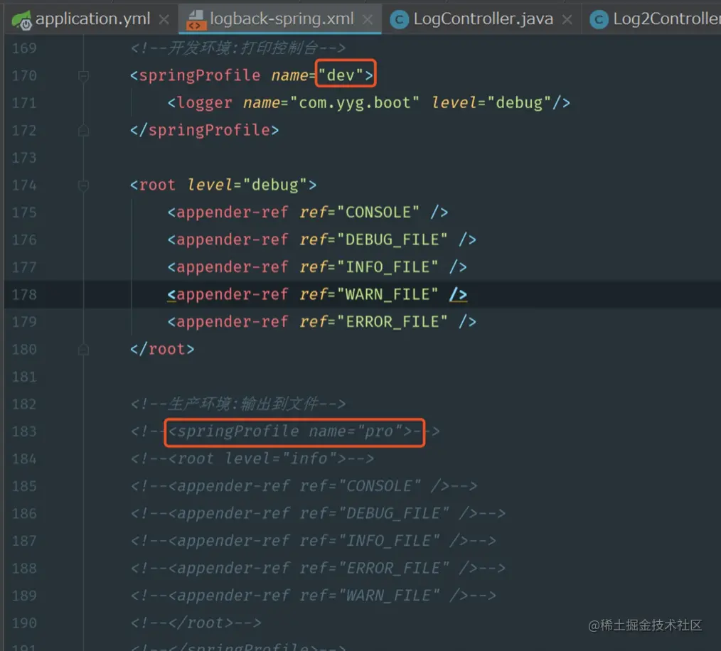 我们开发中会有不同的环境,我们可以根据不同的环境(prod:生产环境,test:测试环境,dev:开发环境)来定义不同的日志输出,可以在logback-spring.xml中使用 springProfile节点来定义,方法如下: