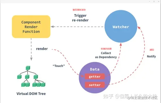 对象内部通过 defineReactive 方法,使用 Object.defineProperty 将属性进行劫持(只会劫持已存在的属性),数组则是通过重写数组来实现。当页面使用对应属性时,每个属性都拥有自己的 dep 属性,存在它所依赖的 watcher (依赖收集)get,当属性变化后会通知自己对应的 watcher 去更新(派发更新)set。