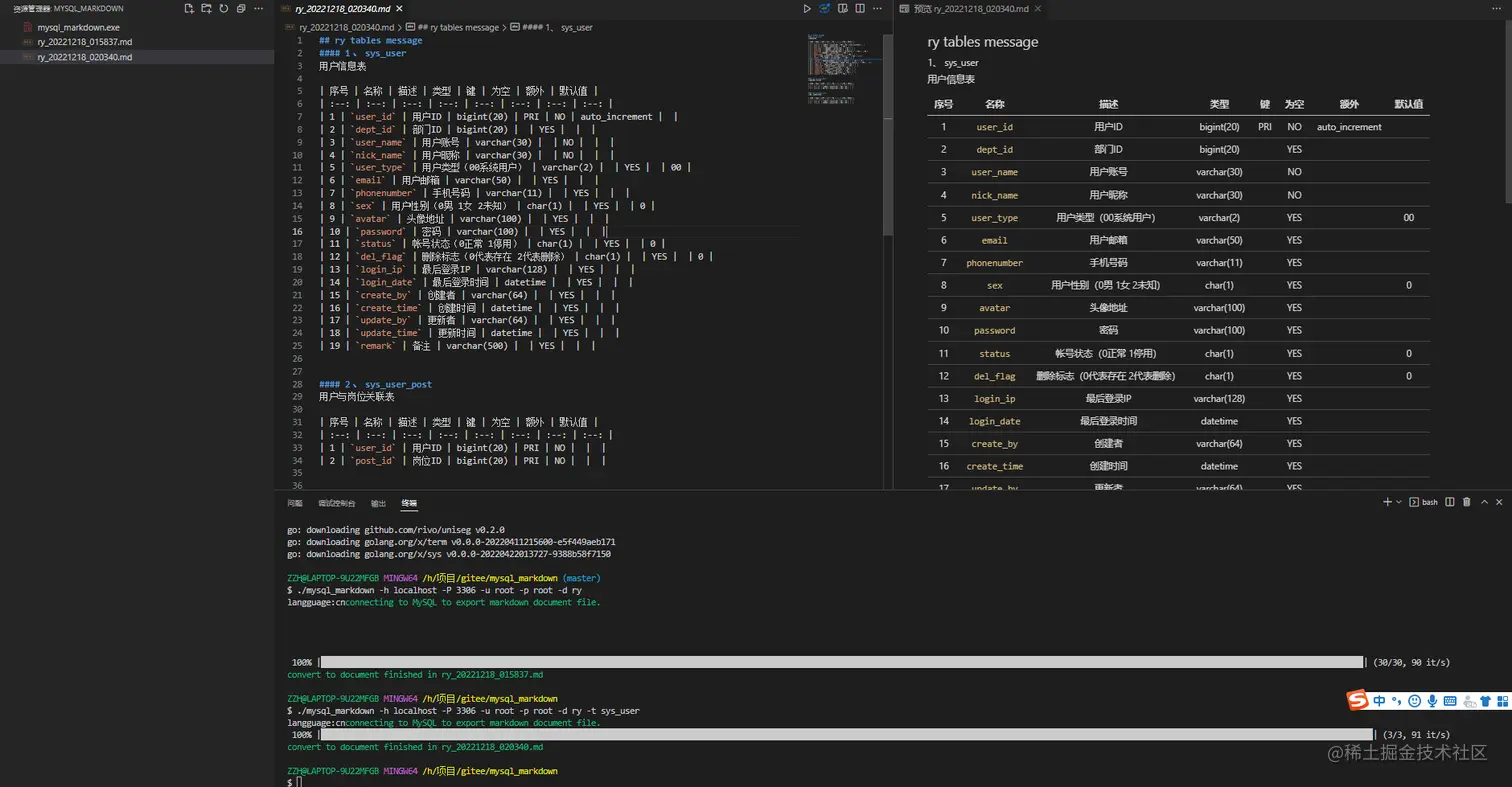 ./mysql_markdown -h localhost -P 3306 -u root -p root -d ry -t sys_user