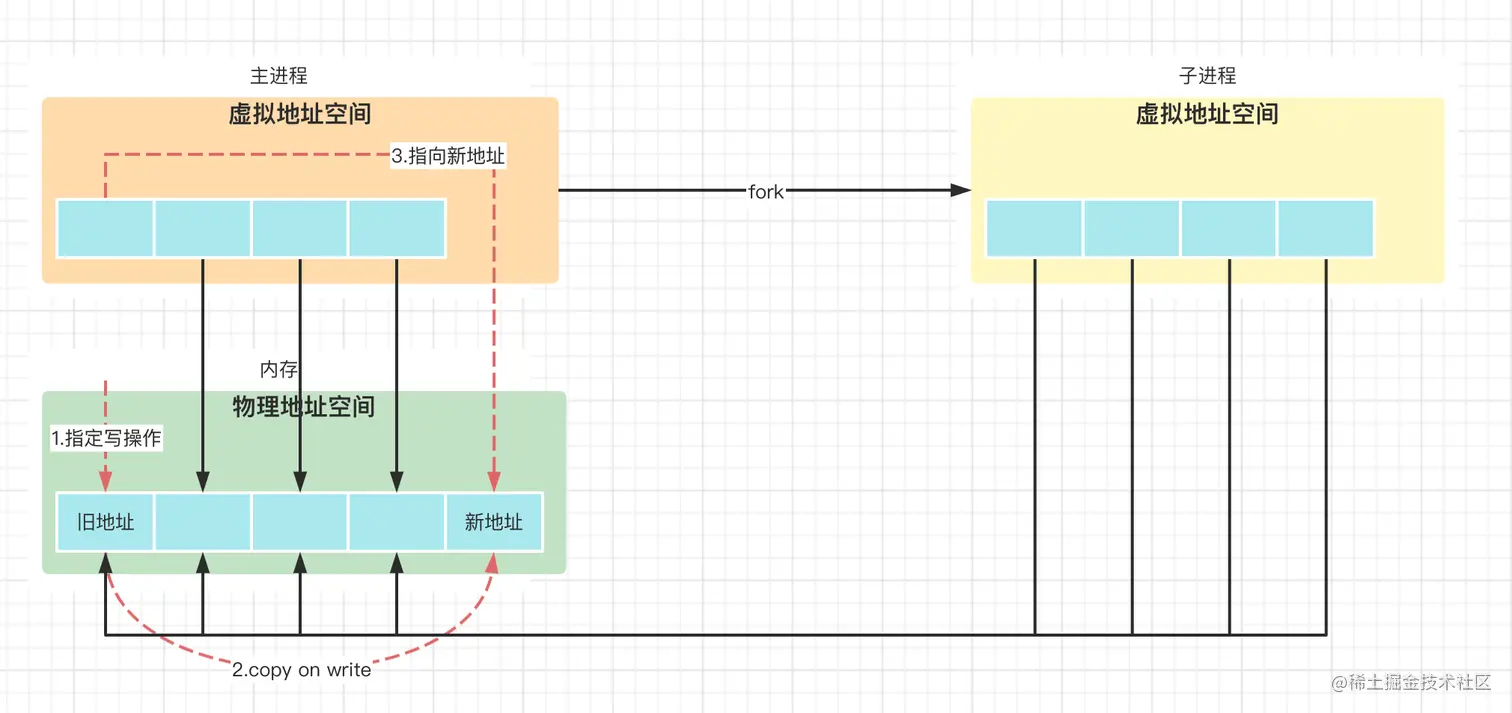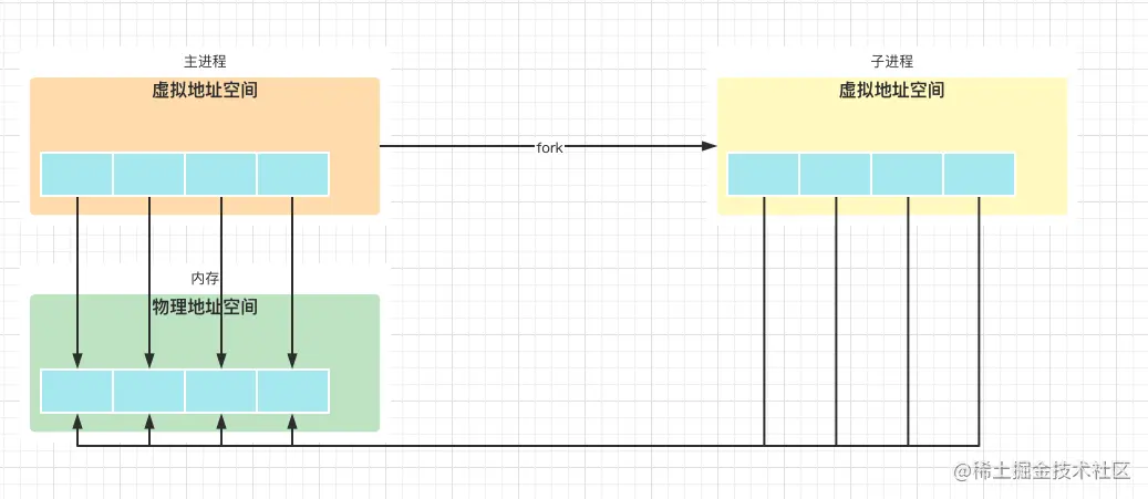 aof文件达到重写要求后,redis会通过fork()系统调用创建出一个子进程(用来执行重写操作),子进程会拷贝主进程的虚拟地址空间,这样主进程和子进程就可以共享内存中的数据。