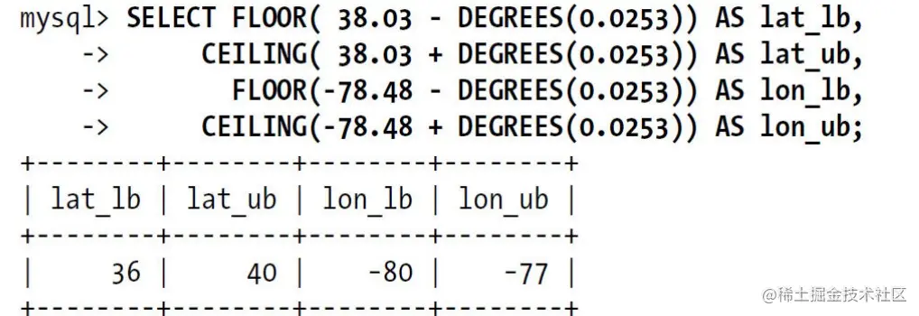 AND lon BETWEEN −78.48 - DEGREES(0.0253) AND −78.48 + DEGREES(0.0253);