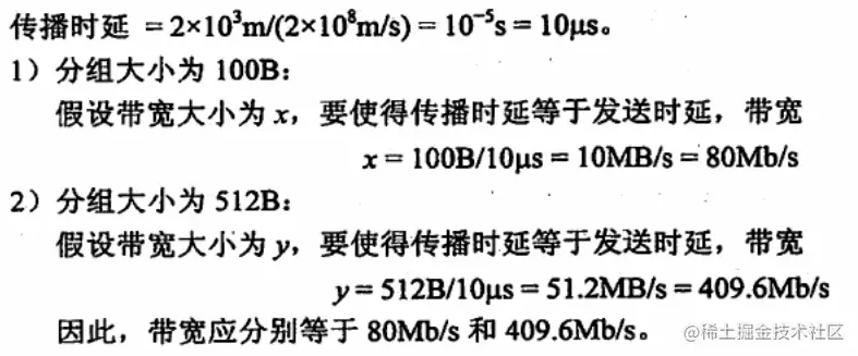 2.考虑一个最大距离为2km的局域网,当带宽等于多大时,传播延时(传播速率为2×10^8m/s)等于100B分组的发送延时?对于512B分组结果又当如何?