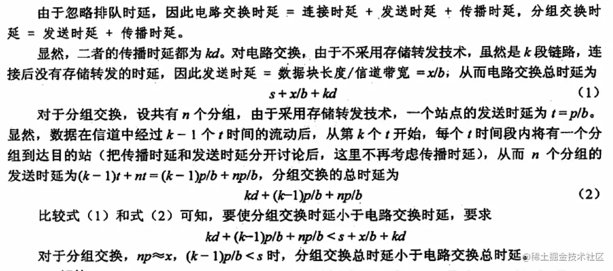 如果网络容易丢失分组,那么对每个分组逐一进行确认较好,此时仅重传丢失的分组。另一方面,如果网络高度可靠,那么在不发生差错的情况下,仅在整个文件传送的结尾发送一次确认,从而减少了确认次数,节省了带宽。不过,即使只有单个分组丢失,也要重传整个文件。4.试在下列条件下比较电路交换和分组交换。要传送的报文共x比特。从源点到终点共经过k段链路,每段链路的传播时延为d秒,数据传输速率为b比特/秒。在电路交换时电路的建立时间为。秒。在分组交换时分组长度为?比特,且各结点的排队等待时间可忽略不计。问在怎样的条件下,分组交换的时延比电路交换的时延要小?(提示:画草图观察k段链路共有几个结点。)
