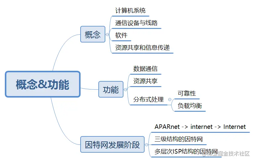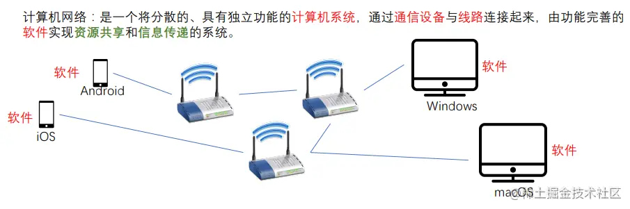 计算机网络:是一个将分散的、具有独立功能的计算机系统,通过通信设备与线路连接起来,有功能完善的软件实现资源共享和信息传递的系统