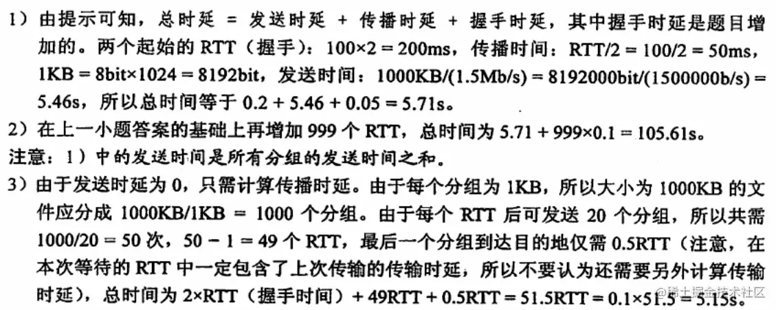 6.在下列情况下,计算传送1000KB文件所需要的总时间,即从开始传送时起直到文件的最后一位到达目的地为止的时间。假定往返时间RTT为100ms,一个分组是1KB(即1024B)的数据,在开始传送整个文件数据之前进行的起始握手过程需要2RTT的时间。 1)带宽是1.5Mb/s,数据分组可连续发送。 2)带宽是1.5M6s,但在发送完每个数据分组后,必须等待一个RTT(等待来自接收方 的确认)才能发送下一个数据分组。 3)假设带宽是无限大的值,即我们取发送时间为0,并在等待每个RTT后可以发送多达20个分组。