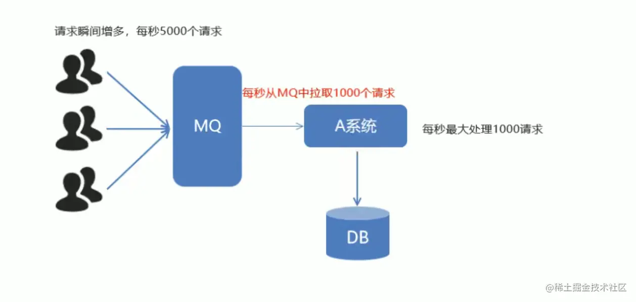 如果请求并发量特别大会让系统宕机,这时我们把并发量全部存到MQ中,然后再每秒从MQ中拉取一些请求进行处理,保证了系统的安全性,从MQ中拉的请求数就是所谓的限流处理,在消费消息的时候做了限流操作