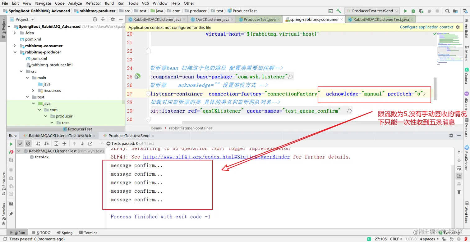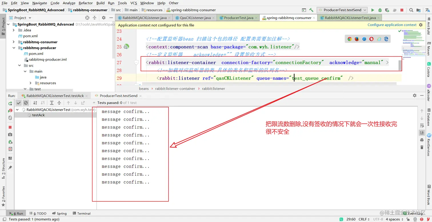 * 1 确保ack的机制为手动确认(只有手动确认才会生效) acknowledge="manual"