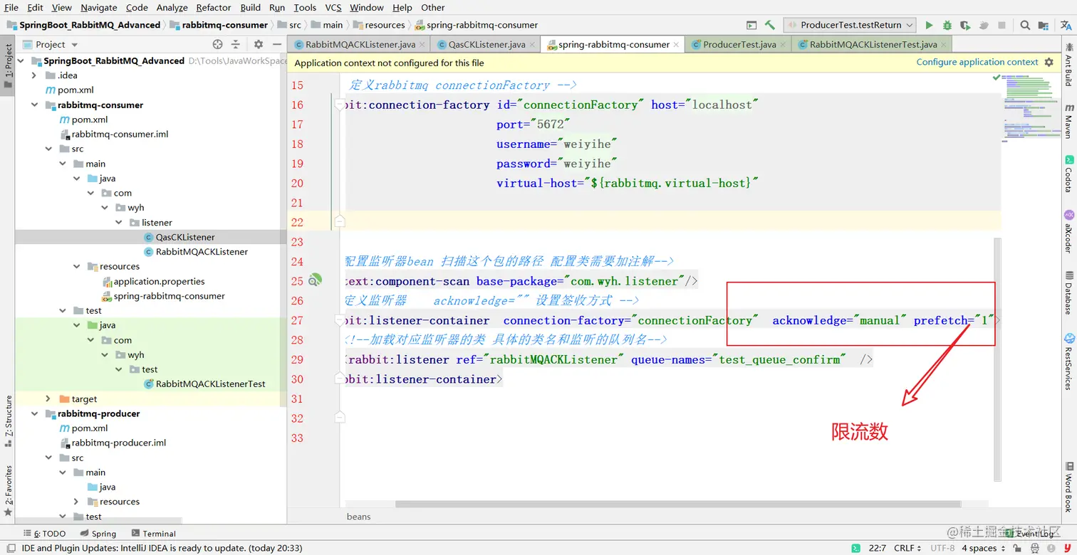 2 配置属性 在配置文件监听listener-container中配置属性prefetch=100