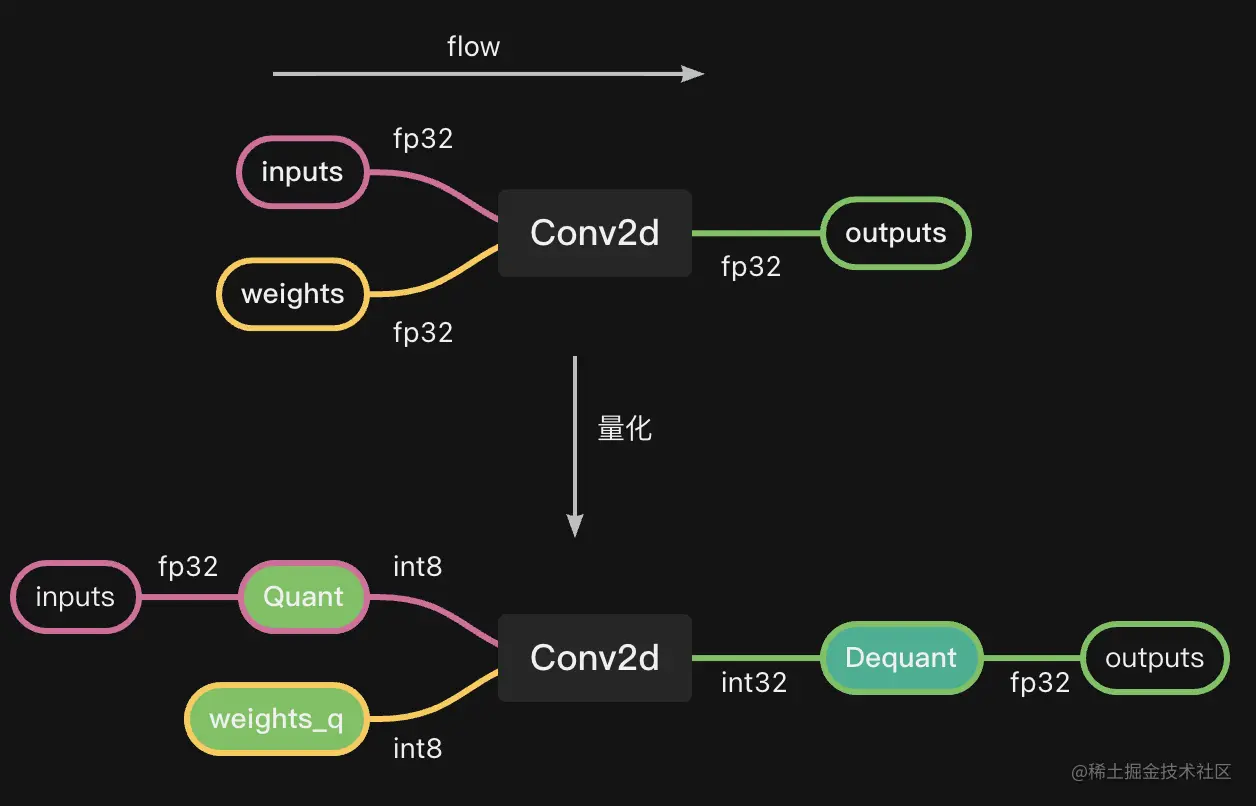 量化分为训练后量化(Post-Training Quantization) 和 量化感知训练(Quantization-Aware Training),这里主要讲的是训练后量化。量化一般不依赖于硬件,所以不管是昇腾的量化还是英伟达的量化甚至是嵌入式设备的量化,都是不用跑在运行环境上的,一般用普通CPU来跑量化的过程就可以了,跑完量化过程后生成一个量化后的模型,然后再送入下一个推理流程。咱们一般指的量化就是权重和数据从float32->int8的过程,但是并不是所有的算子都会进行量化处理,如一些非线性算子(如激活算子)一般就不量化,所以网络中可能会插入一些所谓的dequant的算子,这些算子一定会和quant算子成对出现,量化的运行原理可以用下图来展示:
