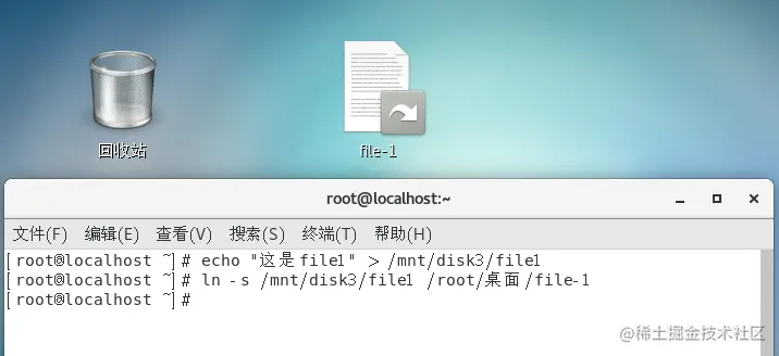 [root@localhost ~]# ln -s /mnt/disk3/file1 /root/桌面/file-1