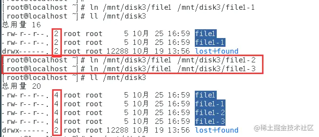 [root@localhost ~]# ln /mnt/disk3/file1 /mnt/disk3/file1-4