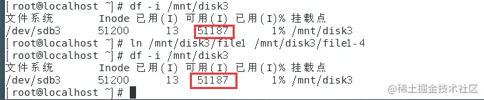 如代码输出所示:file1、file1-1、file1-2、file1-3的inode号都是12,并且在创建file1-4硬链接之前disk3的可用inode数为51187,在创建file1-4之后,disk3的可用inode数仍然是51187,所以硬链接是不占用inode的。