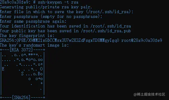 输入下面命令 一直回车,一个矩形图形出现就说明成功,在~/.ssh/下会有私钥id_rsa和公钥id_rsa.pub