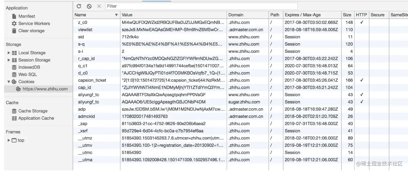Name,即该Cookie的名称。Cookie一旦创建,名称便不可更改。Value,即该Cookie的值。如果值为Unicode字符,需要为字符编码。如果值为二进制数据,则需要使用BASE64编码。Max Age,即该Cookie失效的时间,单位秒,也常和Expires一起使用,通过它可以计算出其有效时间。Max Age如果为正数,则该Cookie在Max Age秒之后失效。如果为负数,则关闭浏览器时Cookie即失效,浏览器也不会以任何形式保存该Cookie。Path,即该Cookie的使用路径。如果设置为/path/,则只有路径为/path/的页面可以访问该Cookie。如果设置为/,则本域名下的所有页面都可以访问该Cookie。Domain,即可以访问该Cookie的域名。例如如果设置为.zhihu.com,则所有以zhihu.com,结尾的域名都可以访问该Cookie。Size字段,即此Cookie的大小。Http字段,即Cookie的httponly属性。若此属性为true,则只有在HTTP Headers中会带有此 Cookie 的信息,而不能通过document.cookie来访问此 Cookie。Secure,即该Cookie是否仅被使用安全协议传输。安全协议。安全协议有HTTPS、SSL等,在网络上传输数据之前先将数据加密。默认为false。