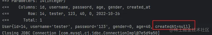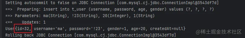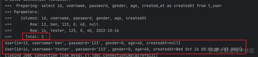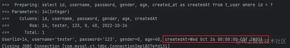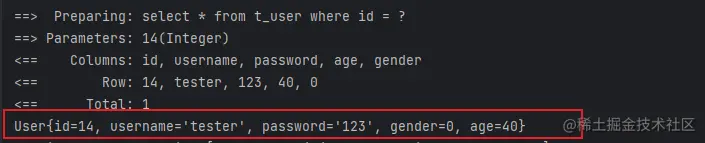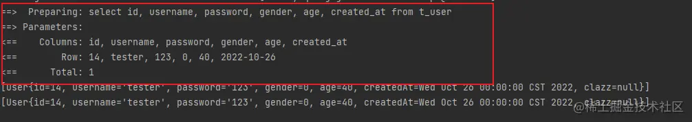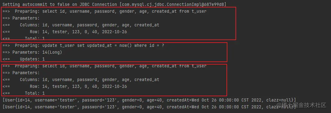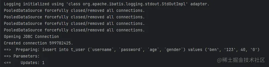 这里使用了mybatis内置的标准日志实现,添加配置后再次执行,就能看到如图所示的日志信息,方便开发调试