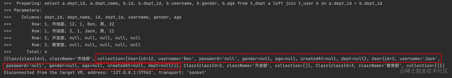 执行查询后,虽然sql结果集为4条,但会将最终映射出来的数据只有3条(同一个部门归类),且Dept类中的集合成功赋值