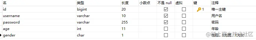 (`username`, `password`, `age`, `gender`)