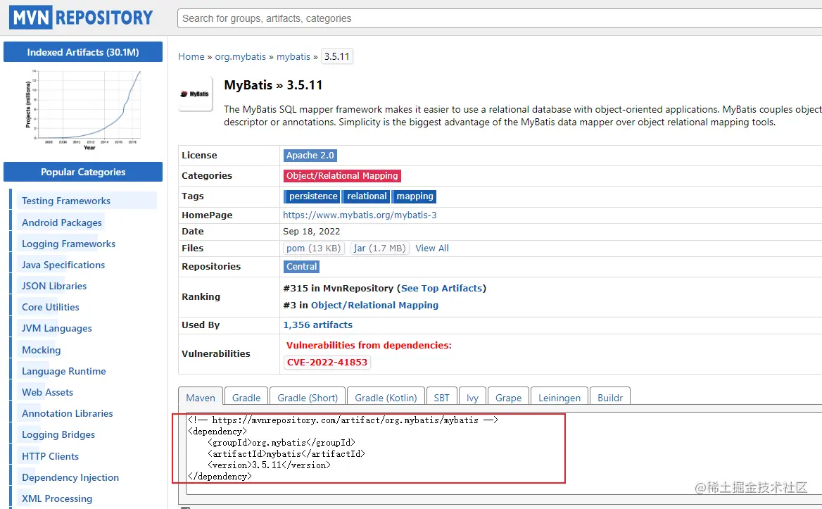 安装Mybatis,传统的模式自然免不了找到对应的Jar包添加成依赖,但通过Maven工具可以方便的控制项目依赖,需要在pom.xml中添加对应依赖,关于Maven这里不介绍过多,不知道GVC怎么写的可以在mvnrepository.com/ maven仓库中搜索对应的即可,比如搜索MyBatis,选择对应的版本,复制如图所示的依赖配置到pom.xml中,刷新maven依赖即可下载,这里除了Mybatis还需要下载mysql-connector,Java链接数据库需要通过驱动,不同厂商有各自的实现
