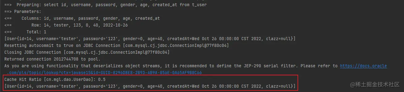 运行后的输出,有一句Cache Hit Ratio且没有第二次sql日志输出,说明缓存命中了