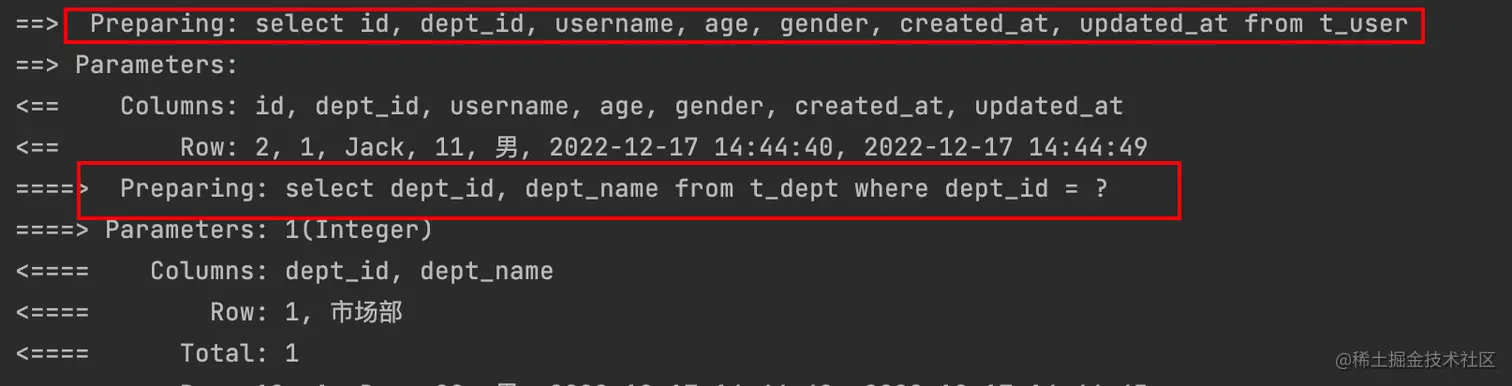 执行查询后,可以看到执行了两条语句,并且会自动将第一步查询出来的dept_id当作查询参数传入第二条sql中