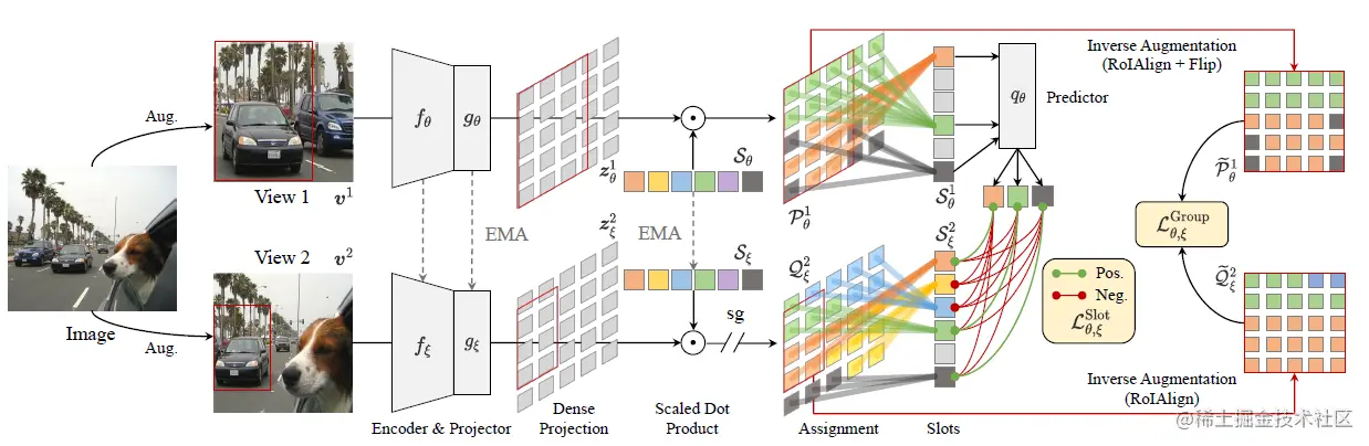 然而,以上方法的基本假设(正样本对,即同一图像的不同视角的图像块,具有相同的语义)在以物体为中心的数据集(ImageNet)中成立,在以场景为中心的数据集(同一图像中包含多个物体,如COCO)中难以成立。为此,该论文将同一图像不同视角图像块内的语义一致的图像区域视为正样本对,语义不同的图像区域视为负样本对。