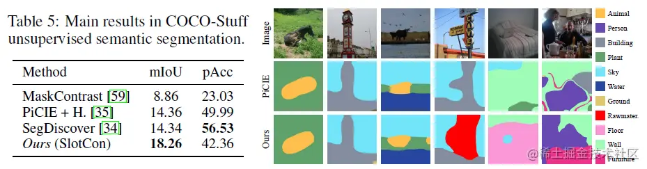 图2展示了无监督分割的定量和定性结果,该方法在此任务上取得不错性能。其mIoU值高出当前无监督分割方法3.92%。