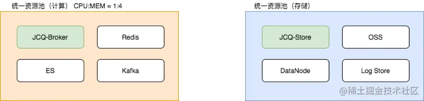 JCQ3.0 后,计算节点 Broker,与存储节点 Store 独立部署。这两个组件可以各自选择适合自己业务的机型,部署在相应资源池中;最终,可以做到与其他产品混合部署,共用资源池水位,而不用独自承担资源水位线。