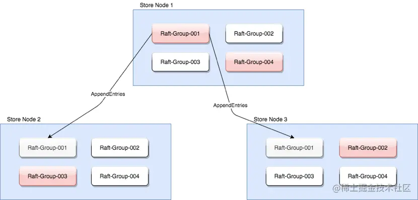 上图中,每个 StoreNode 节点是一个独立进程,内部有四组逻辑 RaftGroup(橙色的节点为 RaftGroup 的 Leader),各组 RaftGroup 之间是并行关系,可以做到 Group 间并行复制、并行 commit。