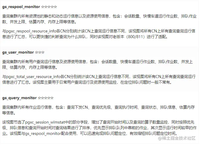 为方便迅速定位问题,根据现网实践经验对以上常见视图进行组合,整合了三个问题定位过程中的常用视图:资源池监控视图、用户监控视图以及作业监控视图。与上面内置视图相比,这几个视图依据现网定位经验与分布式数据库特点,对查询结果做了针对性优化,同时优化了字段显示,用户更易理解,可以作为常规监控视图使用。具体视图定义可参考附件。