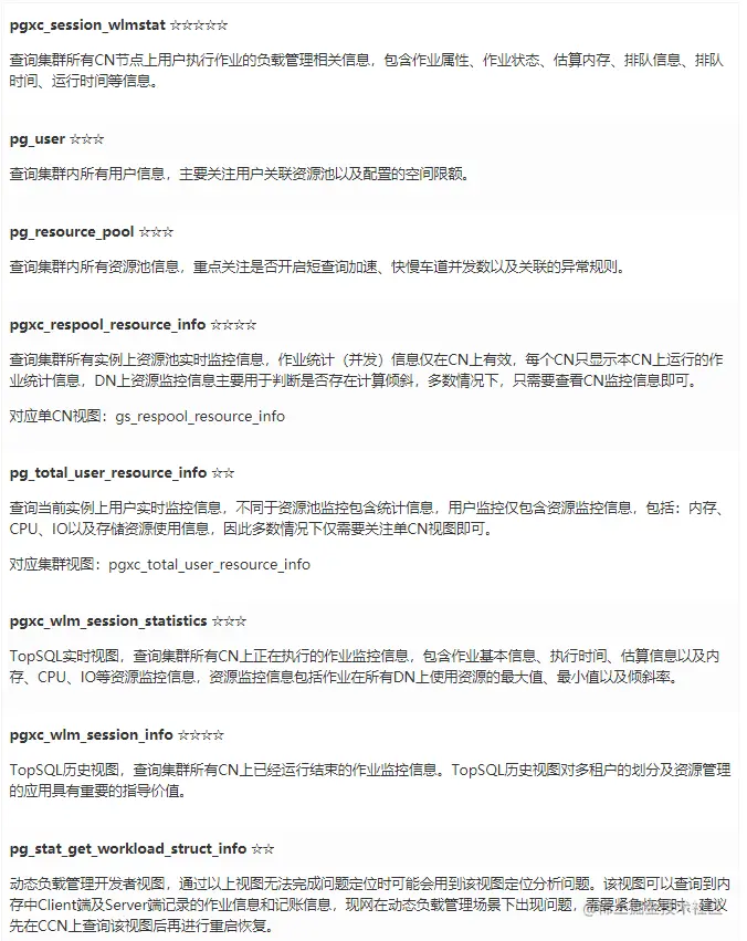 GaussDB(DWS)对外提供诸多系统视图,可以用来辅助资源管理及资源使用相关问题的分析定位,常用视图及用法说明如下表所示。(☆代表常用程度)