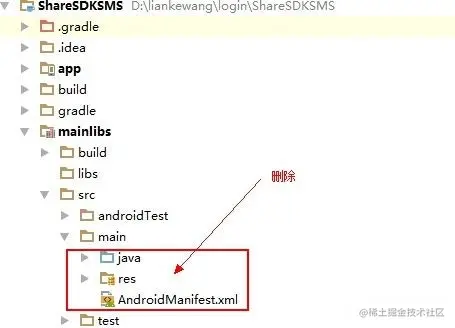 2.删除新创建的 Library 中 main 下面的所有文件,及 java、res两个文件夹和 AndroidManifest.xml 文件,如下图所示: