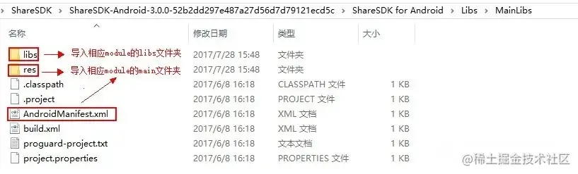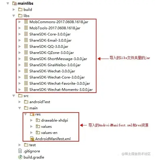 首先,复制 ShareSDk 中的 ShareSDK.xml 文件到项目中的 assets 目录下, 这里使用引入 module 的方式引入 ShareSDk,ShareSDK 里面主要引入如下两个 Libs,如下图所示: