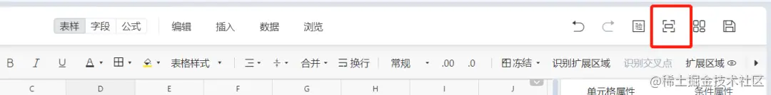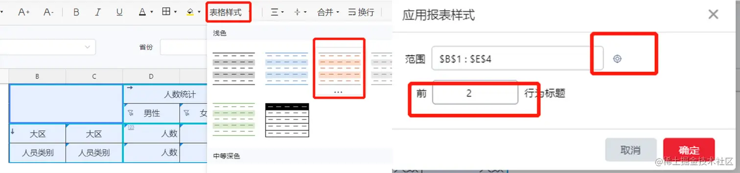 在顶端工具栏,可以快捷选取表格样式设计、行列冻结等功能。选中想要修改的表格区域、勾选表格样式即可实现表格的快速美化。