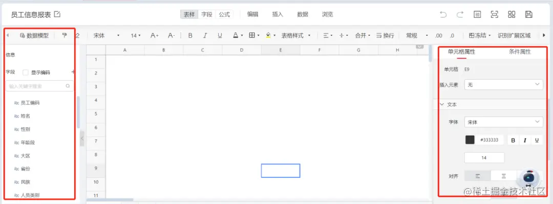 创建报表后点击编辑进入报表编辑页面。其中,左侧为绑定的数据模型中包含的字段,右侧为单元格的具体配置选项。