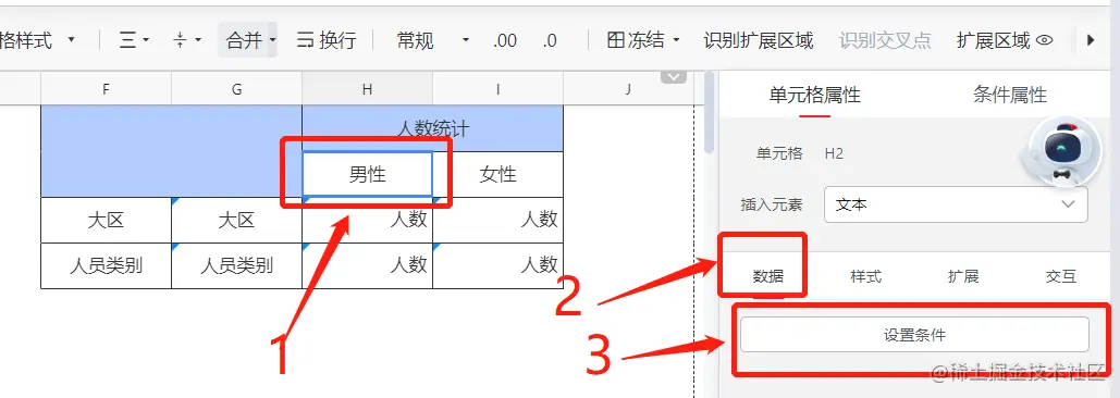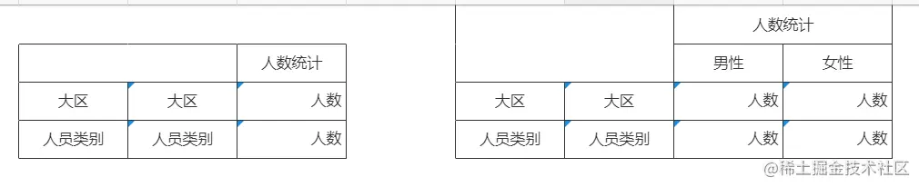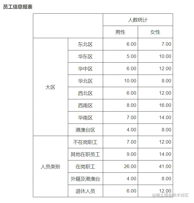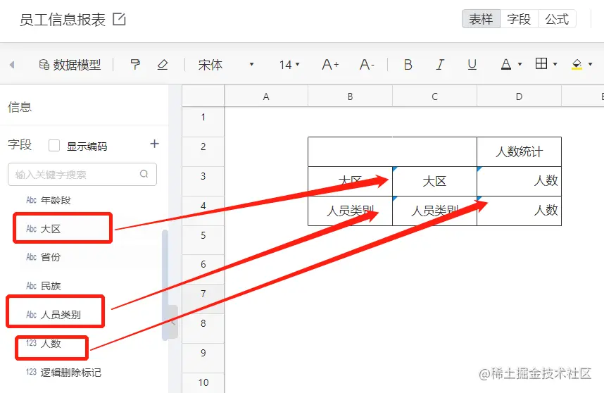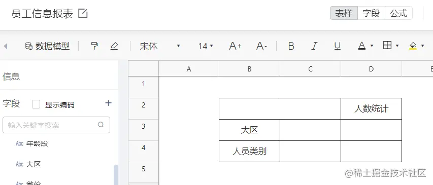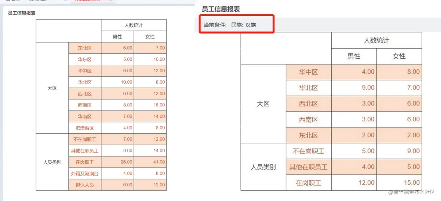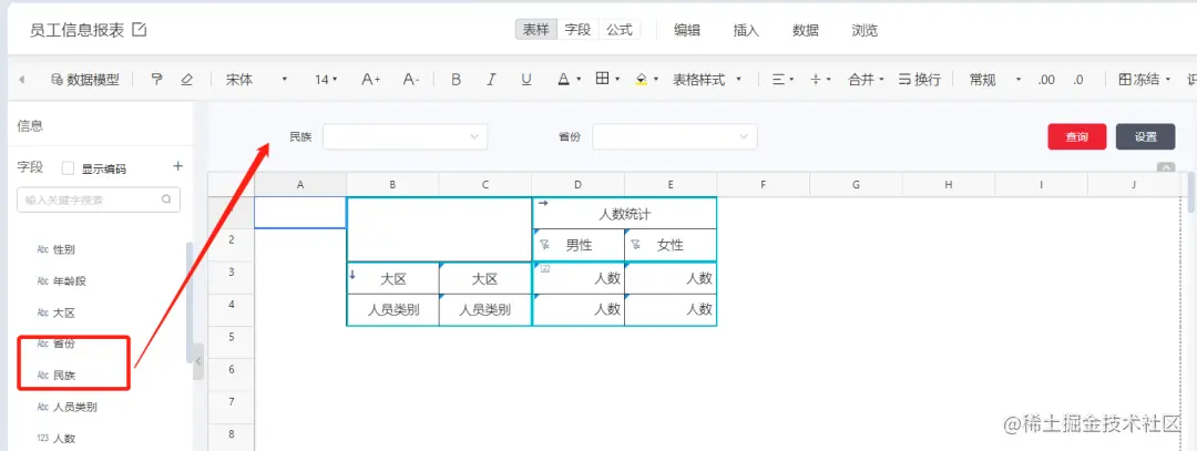 在具体的配置中还可以通过对表头设置数据过滤条件,进一步细分各表头对应的数据。首先将模板进行扩充,可以看到表头由最初的人数统计细分为了不同性别的人数统计。