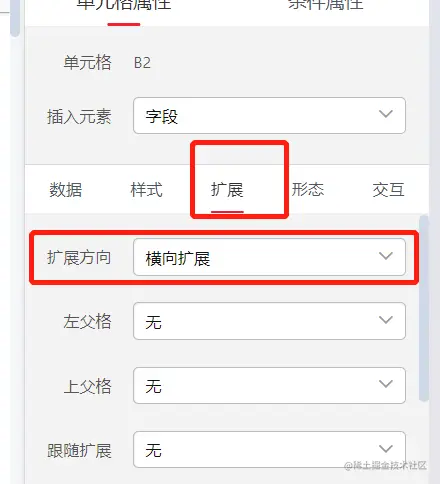 选中具体的单元格后,我们可以对其扩展方向进行具体的配置,如果选中纵向扩展则字段中包含的每个数据项都对应一行,同理选中横向扩展后字段中所有数据项各对应一列数据。