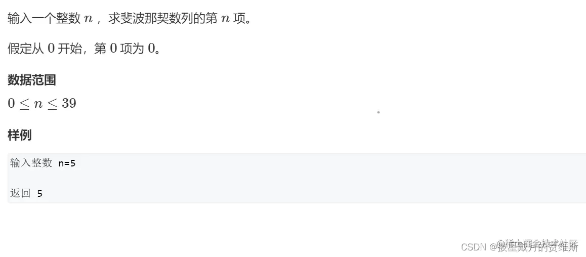 **首先我们看题目要求的数据范围是0到30, 表示int类型足够了,再看n = 5时,输出的也是5, 说明改斐波那契数列是 0 1 1 2 3 5,所以我们可以根据斐波那契数列的递推公式:f(n) = f(n - 1) + f(n - 2)求得答案。