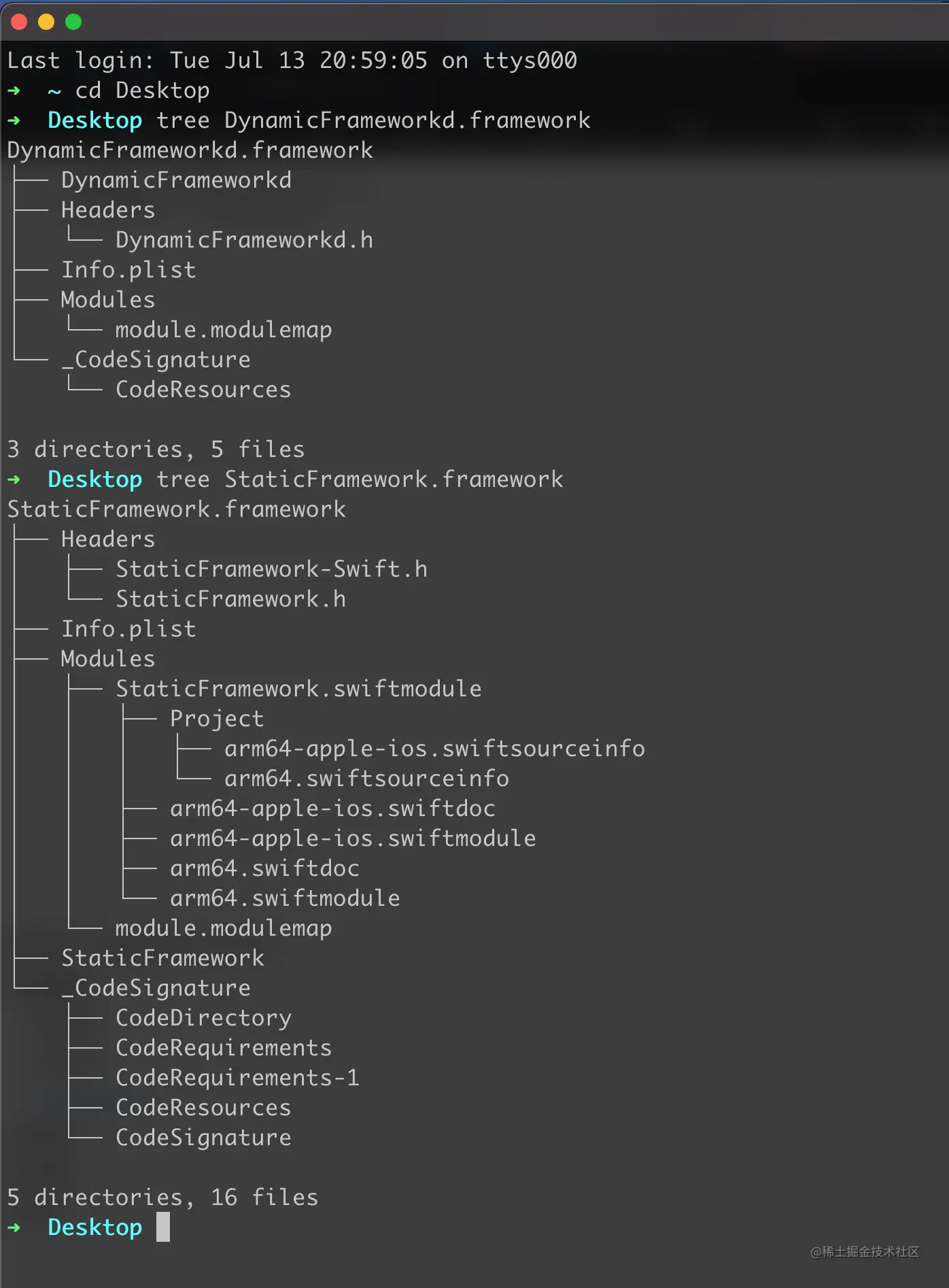 根据苹果官方的解释,Framework 本质上只是一个目录结构,包含了动态库,nib、图片、头文件、文档等资源:
