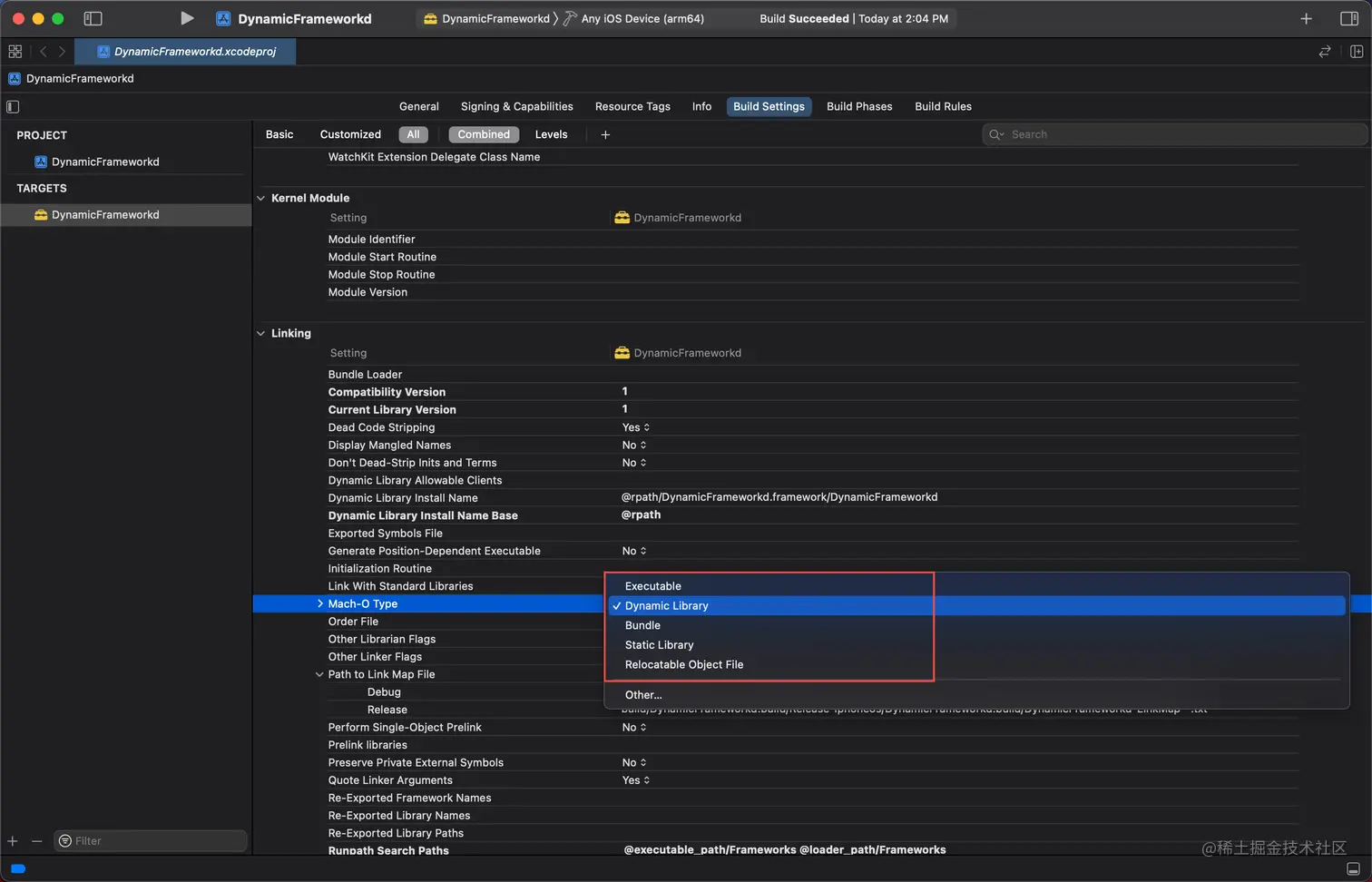 如果我们选择 Framework 模板,则可以在编译设置中配置产物类型: