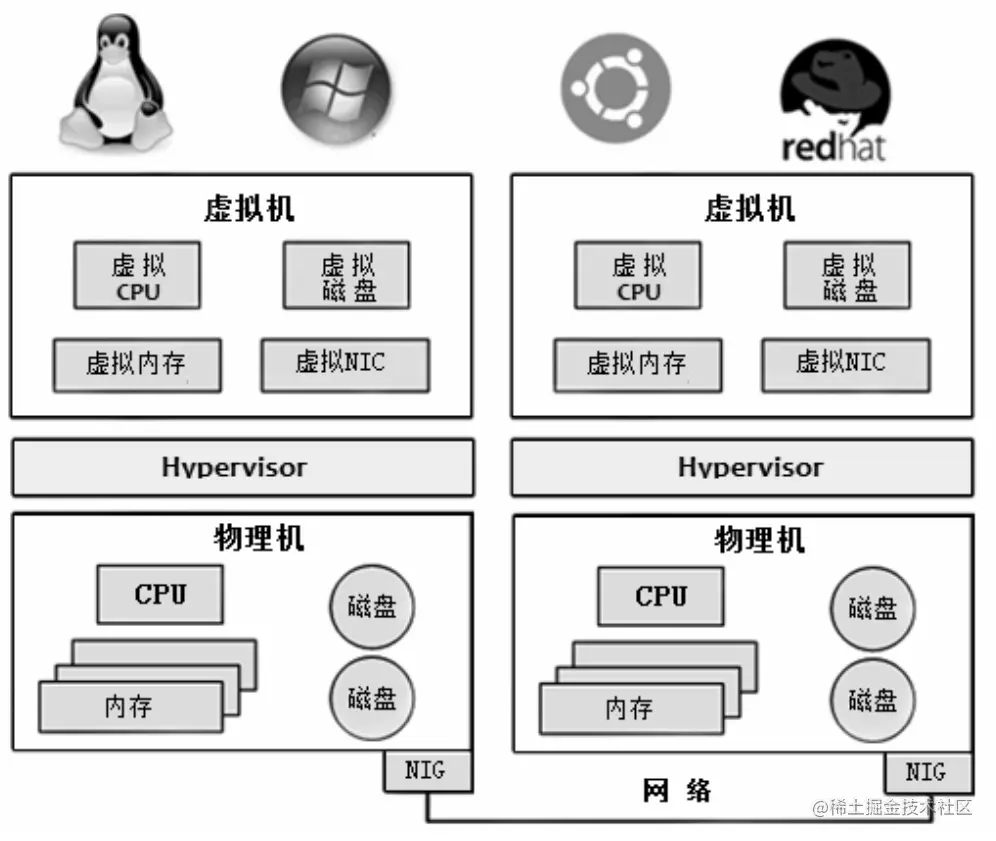 在原生虚拟化中,虚拟化平台运行在硬件上,虚拟机运行在虚拟化平台上,虚拟化平台提供指令集和设备接口,以提供对虚拟机的支持。这种实现通常具有较好的性能,但是实现起来更为复杂。