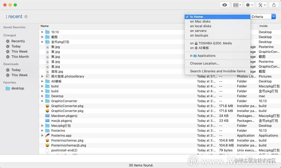 支持的搜索位置:主页,mac磁盘,本地磁盘,服务器,单个磁盘,打开的Finder文件夹。
