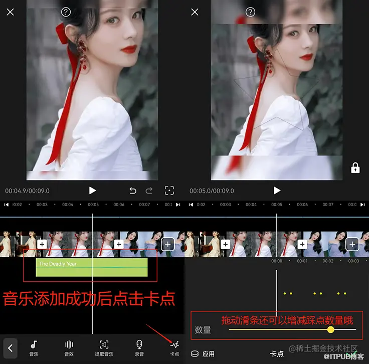 3. 音乐添加好之后点击“踩点”,系统会自动根据音乐的旋律进行踩点,你只需要拖动滑条即可增减踩点数量。