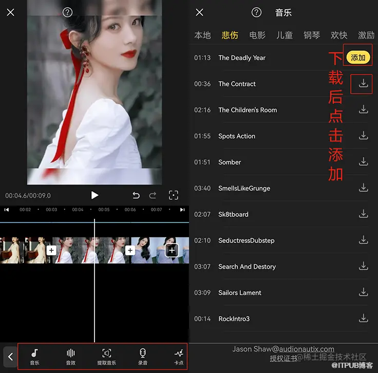 2. 在选择“添加音频”后进入了音乐库,在这里有很多可以用来做为视频音乐的资源,可以点击试听音乐,下载后点击“添加”按钮,这样就成功的把音乐添加到视频中了。