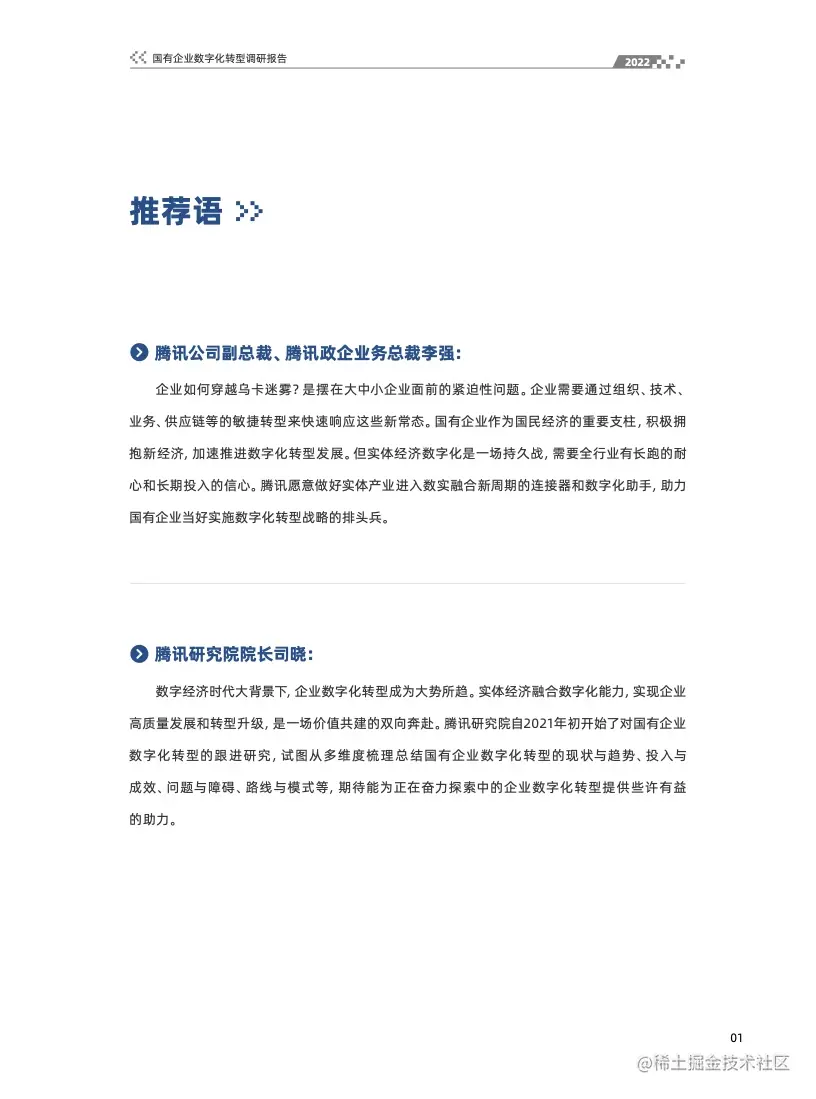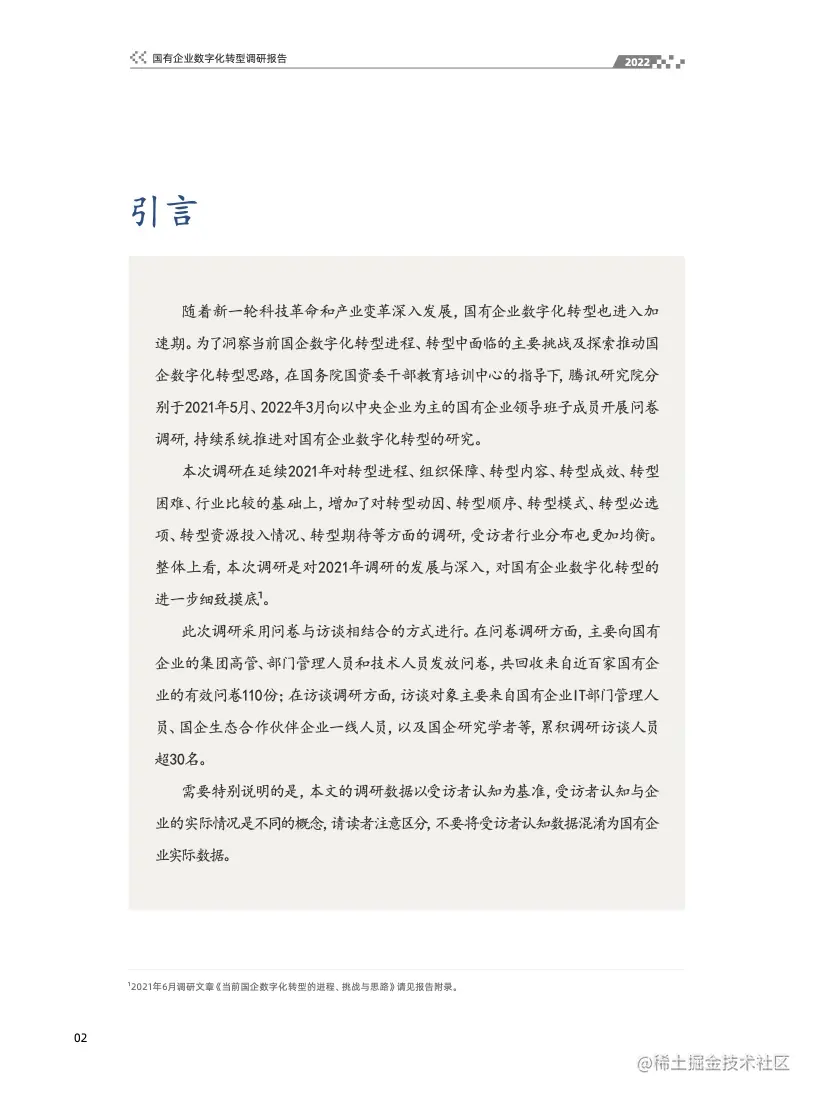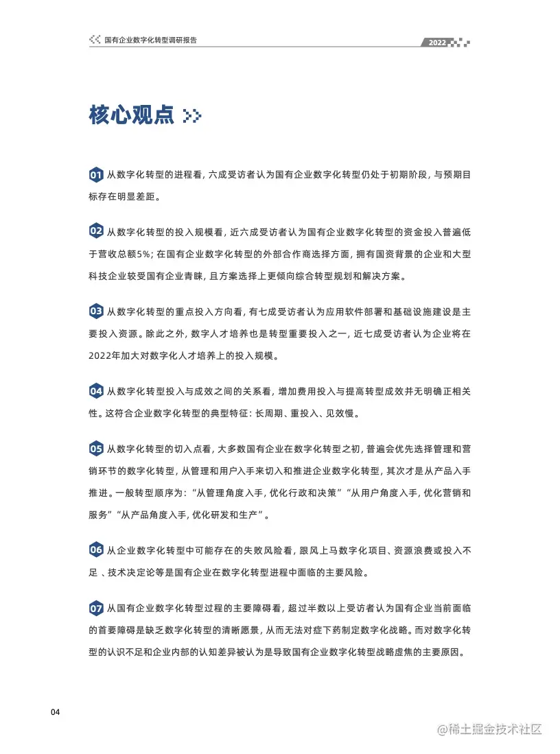 报告从多维度梳理总结国有企业数字化转型的现状与趋势、投入与成效、路线与模式,思路与建议等,同时也整理了国有企业数字化转型案例及当前国有企业数字化转型的进程、挑战与思路,期待能为正在奋力探索中的企业数字化转型提供些许有益的助力。