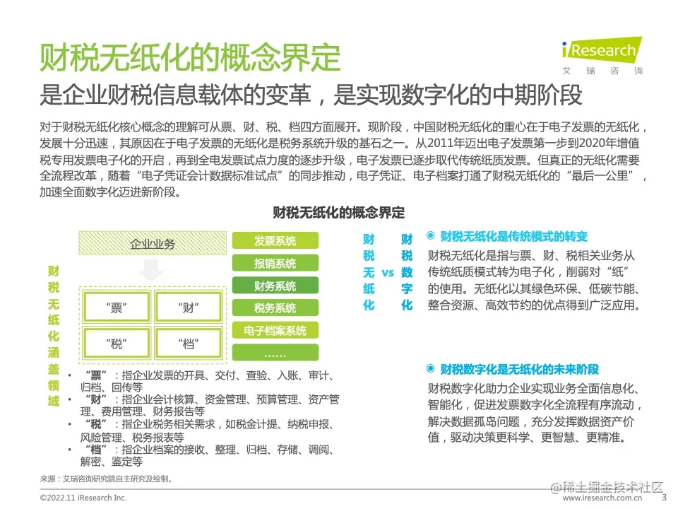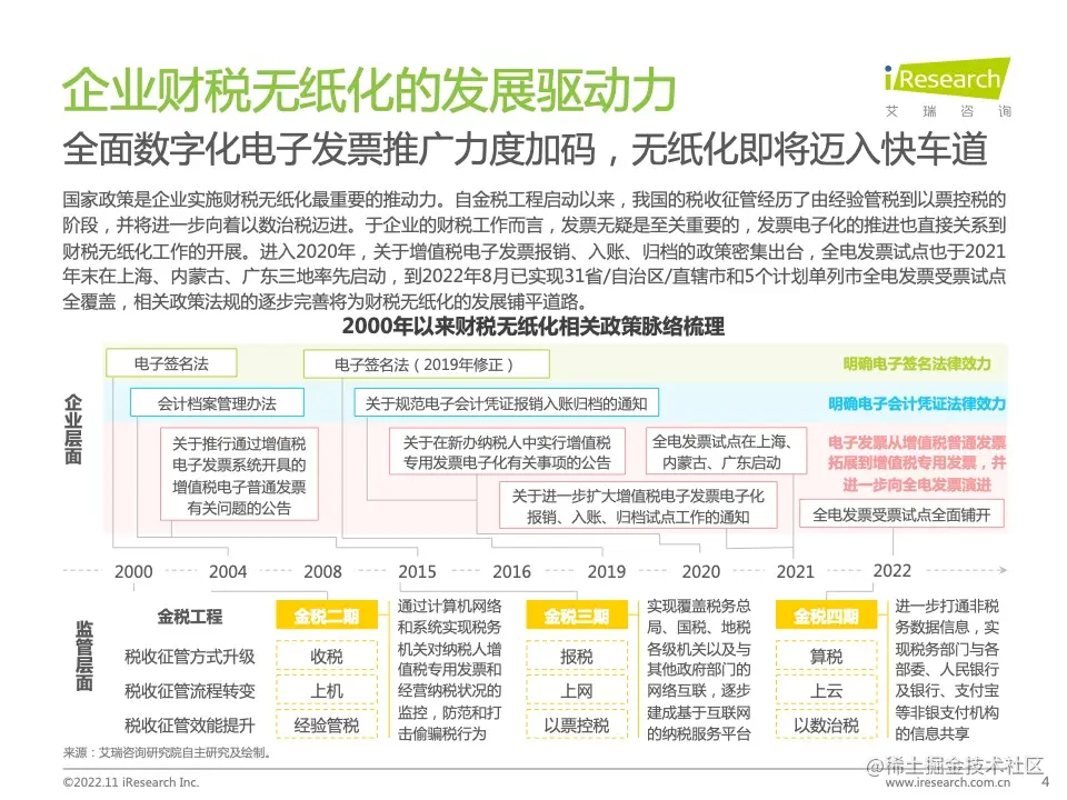 本报告聚焦于企业财税业务的无纸化趋势,自金税工程启动以来,我国正在向以数治税迈进,随着数字化电子发票的推广力度加码,无纸化将成为重要方向。除了相关政策,数字化转型和传统工作模式的变革也是重要驱动力。本报告梳理了业务、发票、财务、税务、档案间的关系,构建了财税无纸化能力的全景图,并对各场景下产品的适配进行了深入解读。此外,报告聚焦于建筑行业和汽车行业,分析了这两大行业企业需求,以及展示了相关的实践案例。