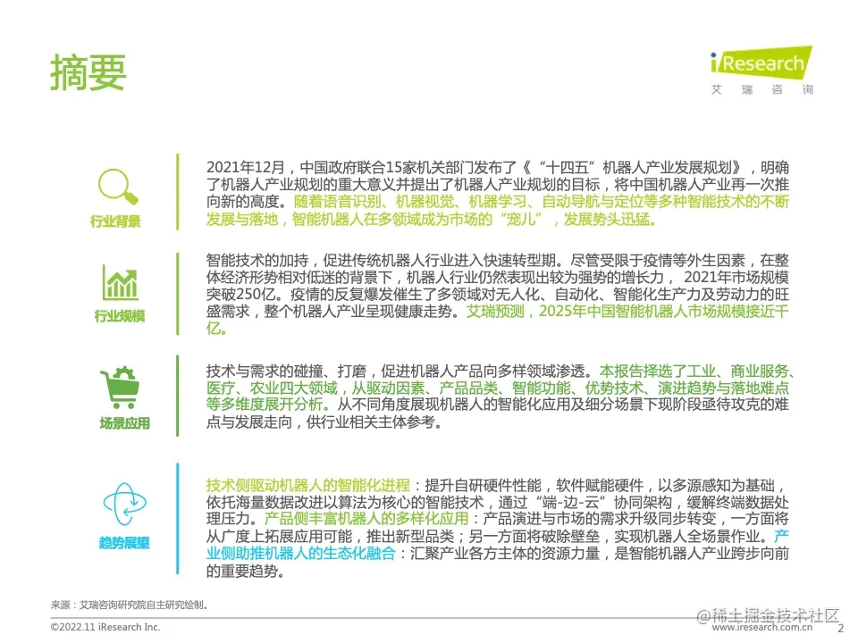 智能技术的加持,促进传统机器人行业进入快速转型期,对无人化、自动化、智能化生产力的旺盛需求,整体产业发展势头迅猛。本报告聚焦智能机器人领域,从产业现状、市场洞察、领域应用、未来趋势等角度展开分析,供行业相关主体参考。