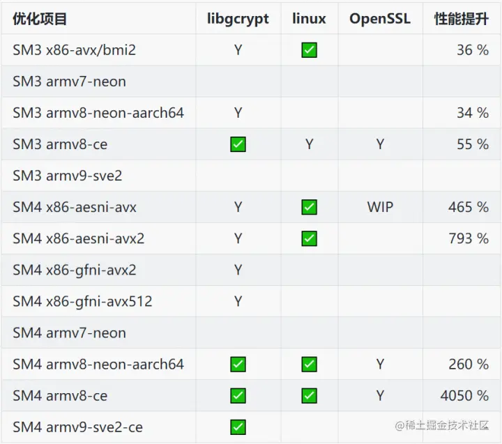 - SM4 CCM/GCM 模式支持使用 CE 指令集优化,CCM 和 GCM 是带认证的 AEAD 算法,是 TLS 1.3 协议中非常主流的算法模式,这也为 TLS 协议支持国密提供了性能保证。