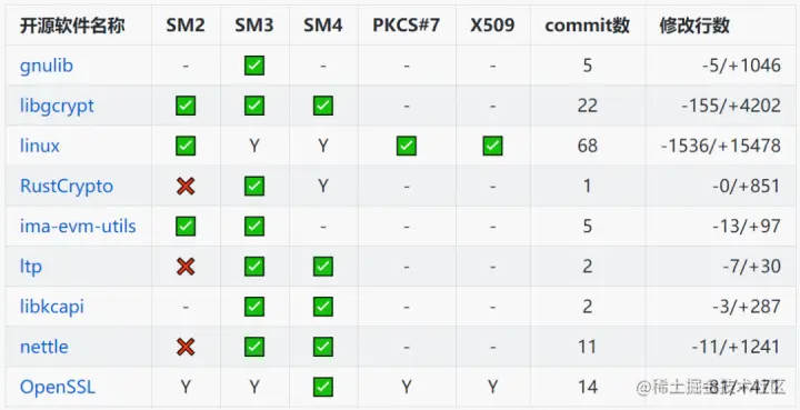 当前相关的主要开源软件栈对国密的支持情况以及社区回馈统计: