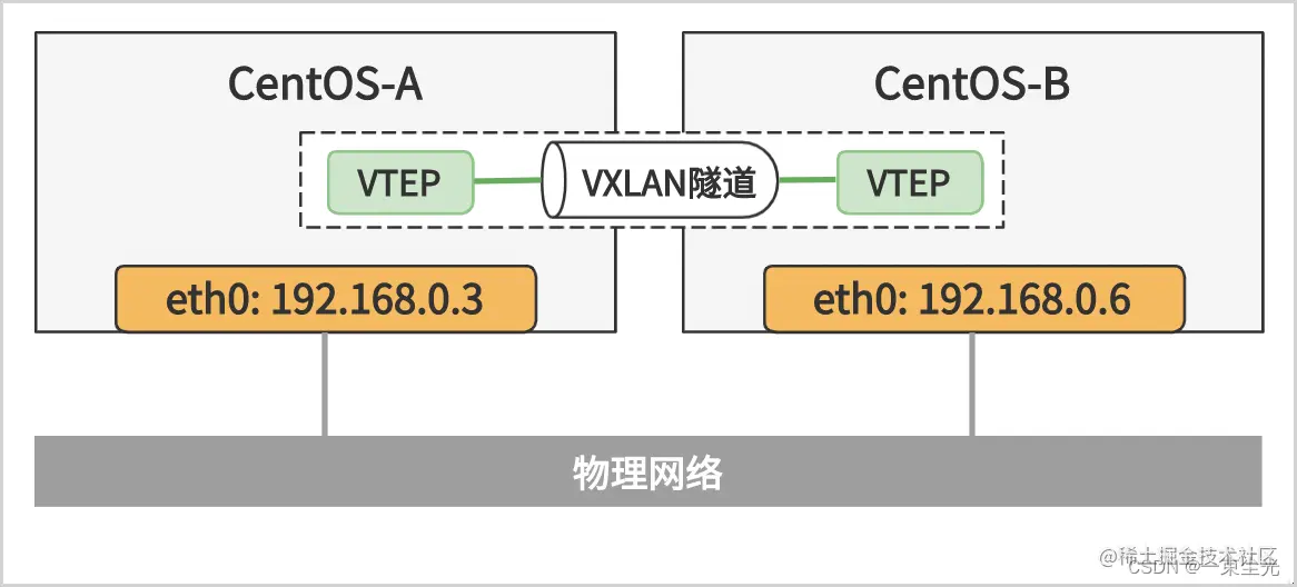 VXLAN 是在底层物理网络(Underlay)之上使用隧道技术,借助 UDP 层构建的 Overlay 逻辑网络,它对原有的网络架构几乎没有影响,不需要对原网络做任何改动,就可以架设一层新的网络